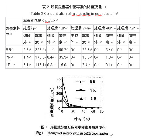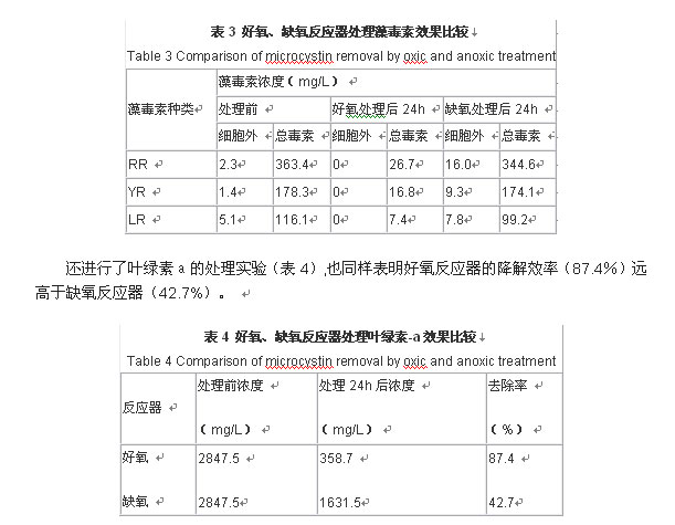 好(hao)氧(yang)(yang)(yang)(yang)和缺氧(yang)(yang)(yang)(yang)兩種(zhong)方法處理(li)(li)(li)(li)藻(zao)毒(du)素(su)的(de)結果(guo)(guo)如(ru)表3所示。經(jing)過24h處理(li)(li)(li)(li)后,好(hao)氧(yang)(yang)(yang)(yang)反(fan)應(ying)(ying)器(qi)對(dui)總藻(zao)毒(du)素(su)去(qu)除率分別(bie)(bie)為RR 92.7%、YR 90.6%、LR 93.6%;而在(zai)(zai)同樣處理(li)(li)(li)(li)時間條件下(xia)的(de)缺氧(yang)(yang)(yang)(yang)反(fan)應(ying)(ying)器(qi)處理(li)(li)(li)(li)效果(guo)(guo)則分別(bie)(bie)為:RR 5.2%、YR 2.4%、LR 14.6%。兩種(zhong)反(fan)應(ying)(ying)器(qi)處理(li)(li)(li)(li)效果(guo)(guo)對(dui)比(bi)明(ming)顯(xian),這表明(ming),好(hao)氧(yang)(yang)(yang)(yang)工藝去(qu)除藻(zao)毒(du)素(su)能力遠比(bi)缺氧(yang)(yang)(yang)(yang)有效。從表3中(zhong)還可(ke)以(yi)觀察到另(ling)一個(ge)和好(hao)氧(yang)(yang)(yang)(yang)反(fan)應(ying)(ying)器(qi)不同的(de)特點是缺氧(yang)(yang)(yang)(yang)反(fan)應(ying)(ying)器(qi)中(zhong)藻(zao)毒(du)素(su)的(de)細胞(bao)外濃度在(zai)(zai)處理(li)(li)(li)(li)24h后,反(fan)而增加(jia)了,很明(ming)顯(xian),這是由于在(zai)(zai)缺氧(yang)(yang)(yang)(yang)條件下(xia)兼性厭氧(yang)(yang)(yang)(yang)菌的(de)水解作用,使藍(lan)藻(zao)細胞(bao)內(nei)的(de)毒(du)素(su)溶解進入水中(zhong)而引起的(de)。