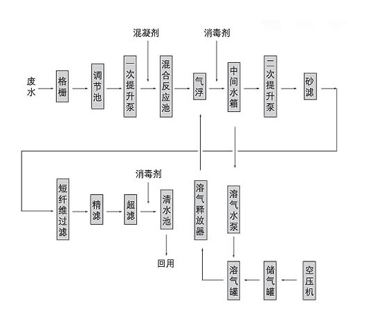 混合反應器污水中懸浮雜質形成的礬花在氣浮器底部與溶氣釋放器的溶氣水相遇,溶氣水進入底部后突然減壓,礬花與溶氣水中微小氣泡發生碰撞,當礬花吸附一定量氣泡后,逐漸上浮到水面。而下部的水變清流如水中間水箱。砂濾、短纖維過濾、精濾、超濾氣浮出水經二次提升泵依次進入砂濾、短纖維過濾、精濾及超濾。