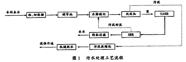 車(che)間高濃度(du)污(wu)(wu)水(shui)(shui)(shui)由廠(chang)區污(wu)(wu)水(shui)(shui)(shui)管(guan)道收集后(hou),經粗、細(xi)格柵去(qu)除污(wu)(wu)水(shui)(shui)(shui)中的(de)漂(piao)浮物(wu)(wu)和大的(de)懸浮物(wu)(wu),然后(hou)進入水(shui)(shui)(shui)解酸化池(chi)(chi)進行預處(chu)(chu)理。為改善UASB的(de)進水(shui)(shui)(shui)條件,水(shui)(shui)(shui)解酸化池(chi)(chi)出水(shui)(shui)(shui)進入平流(liu)式沉(chen)淀池(chi)(chi)沉(chen)淀,污(wu)(wu)水(shui)(shui)(shui)沉(chen)淀后(hou)進入UASB,去(qu)除大部(bu)分有(you)機(ji)物(wu)(wu),出水(shui)(shui)(shui)至SBR污(wu)(wu)泥反(fan)應池(chi)(chi),在其(qi)中將有(you)機(ji)物(wu)(wu)徹底降解,最后(hou)進入陶(tao)粒濾池(chi)(chi),降低(di)色度(du)。污(wu)(wu)水(shui)(shui)(shui)處(chu)(chu)理工藝如(ru)圖1所示。