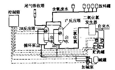 二氧化氯處理含氰廢水已有報道,但目前在實踐中應用還少。該廠在廣泛調研及小試的基礎上,選用了以二氧化氯發生器為主要設備的處理工藝。該工藝主要由二氧化氯發生器、在線pH檢測儀表及PLC控制箱組成,設備簡單,操作方便,實現了pH調節、二氧化氯投加、氧化反應及廢水排放過程的全部自動化。經調試運行表明,該系統處理效率高,運行安全可靠。