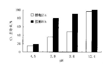 由圖2可以看出,pH值對二氧化氯除氰的效率具有明顯的影響,當pH為酸性的情況下,接觸時間的加長對去除率并無明顯改進,CN-的去除率不到20%,這說明二氧化氯在酸性條件下,對氰化物的氧化作用是極低的。當pH為弱堿性條件時,如圖中的pH=7.8,9.8時,隨著接觸時間的加長,去除率也相應提高,當接觸時間達到6 h時,去除率都可達到80%以上,當pH達到12.4時,接觸2 h的去除率就可達到98.3%。這說明,二氧化氯對氰化物的氧化作用可以在弱堿性條件下進行,這與資料記載相吻合,但相應的應提高反應的時間。如果需要在短時間內完成,則必須保持較高的反應pH值。