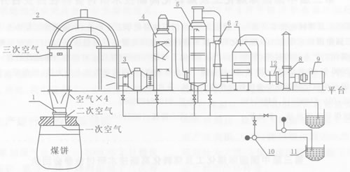 1-導套;2-燃燒室;3-冷卻器;4-旋流板除塵器;5-旋流板塔;6-文丘里除塵器;