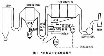 浙江巨化集團公司熱電廠八期采用的NID脫硫工藝是浙江菲達機電集團公司引進瑞典ABB公司(現為ALSTOM公司)的半干法脫硫技術,并經國產化的新型煙氣處理工藝系統。NID工藝的原理為利用含石灰(CaO)的干反應劑或干的熟石灰Ca(OH)2與煙氣中的SO2反應,反應式為: