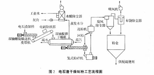 廢電石渣經堆放蒸發和脫水,其含水率一般在40%左右,由雙軸螺旋輸送機加到皮帶機上,經電磁除鐵器除鐵后,送入雙軸攪拌干燥機,干燥機中的電石渣在蒸汽的間接加熱下使水分蒸發。從干燥機輸出的干料經FS型籠式粉碎機破碎,進入選粉機進行分離,粗料回粉至破碎機,細料進入粉倉,供脫硫裝置使用。