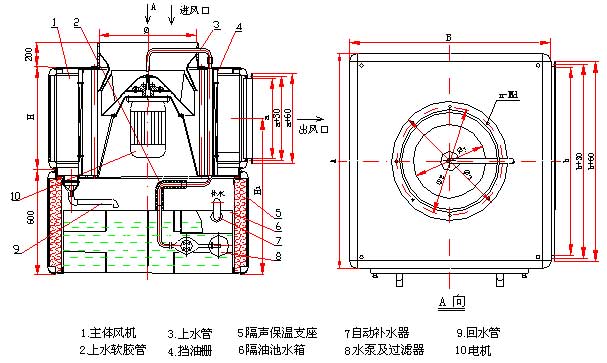 YZL型(xing)濕式凈(jing)化風機按進(jin)風口的(de)位置分(fen)為上進(jin)風YZL-Ⅰ和下進(jin)風YZL-Ⅱ兩種型(xing)式。YZL-I型(xing)油(you)(you)煙(yan)(yan)凈(jing)化風機特點為油(you)(you)煙(yan)(yan)氣從上部進(jin)入(ru)風機葉(xie)輪(lun),工作時風機葉(xie)輪(lun)水(shui)(shui)(shui)平旋轉(zhuan),水(shui)(shui)(shui)泵將水(shui)(shui)(shui)箱中(zhong)的(de)水(shui)(shui)(shui)輸(shu)送到風機葉(xie)輪(lun)中(zhong)心導風帽處(chu)。YZL-II型(xing)油(you)(you)煙(yan)(yan)凈(jing)化風機特點為油(you)(you)煙(yan)(yan)氣從下部進(jin)入(ru)風機葉(xie)輪(lun),工作時風機葉(xie)輪(lun)水(shui)(shui)(shui)平旋轉(zhuan),通過葉(xie)輪(lun)旋轉(zhuan)產生的(de)自(zi)身吸力(li)將水(shui)(shui)(shui)箱中(zhong)的(de)水(shui)(shui)(shui)輸(shu)送到風機葉(xie)輪(lun)中(zhong)心導風帽處(chu)。