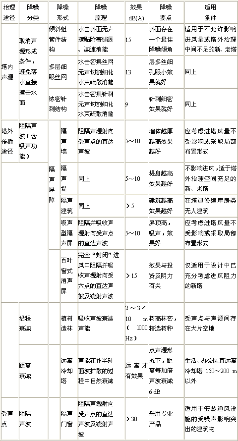 針對噪聲(sheng)的(de)發生機理、傳(chuan)播方式,可以(yi)把冷卻塔噪聲(sheng)的(de)治理歸結為(wei)塔內、塔外(wai)(wai)兩條(tiao)基本途徑,塔內以(yi)聲(sheng)源的(de)降噪治理為(wei)主(zhu);塔外(wai)(wai)則包含有傳(chuan)聲(sheng)途徑上的(de)聲(sheng)波(bo)阻(zu)隔(ge)(ge)(隔(ge)(ge)聲(sheng))、聲(sheng)波(bo)吸收(合沿程吸收衰減)以(yi)及距離衰減(聲(sheng)能擴(kuo)散)等三種(zhong)方式。其中以(yi)聲(sheng)波(bo)阻(zu)隔(ge)(ge)輔以(yi)聲(sheng)波(bo)吸收為(wei)塔外(wai)(wai)治理的(de)主(zhu)要(yao)手段,無論是塔內的(de)聲(sheng)源治理技(ji)術還(huan)是國(guo)外(wai)(wai)已有應(ying)用(yong)的(de)塔外(wai)(wai)聲(sheng)波(bo)阻(zu)隔(ge)(ge)技(ji)術,在我國(guo)的(de)應(ying)用(yong)還(huan)剛起(qi)步,因而都缺乏(fa)實踐應(ying)用(yong)經驗。下(xia)面列(lie)表歸納并推(tui)薦(jian)幾種(zhong)冷卻塔噪聲(sheng)的(de)治理技(ji)術供(gong)工程參(can)考選(xuan)用(yong),各自的(de)特點、適用(yong)性參(can)見下(xia)表。