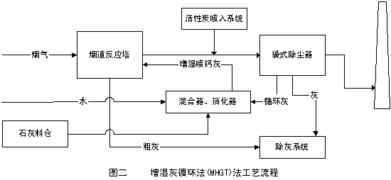 多組分有毒廢氣治理技術(MHGT),系在引進的增濕灰循環酸性氣體脫除技術(NID)基礎上開發的煙氣凈化技術。MHGT技術是將石灰粉與除塵器收集的循環灰在混合增濕器內混合,并加濕活化后導入煙道反應器內發生脫酸反應。由于含水循環灰有較好的流動性,省去了復雜的制漿系統,克服了噴霧過程的粘壁現象。但由于灰循環比較大(30~50),因此布袋除塵器處理能力要求比其它工藝技術高,磨損也相對較大。