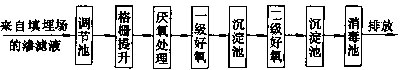 結合本(ben)工程設計,我們進行(xing)了(le)大量的調(diao)查及(ji)研(yan)討,總(zong)結國內外各種城市垃圾填(tian)埋場滲濾(lv)液(ye)處(chu)理經驗,認為滲濾(lv)液(ye)處(chu)理宜采用(yong)厭(yan)氧、好氧相結合的處(chu)理方法。浙江省(sheng)某城市垃圾填(tian)埋場的滲濾(lv)液(ye)處(chu)理采用(yong)如下(xia)工藝流程: