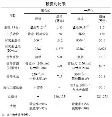 3臺29MW鍋爐配用一體化設備與組合式脫硫除塵設備的投資對比見下表。