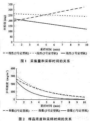 通過對表1監測數據的分析,發現采樣時間和采集量及濃度有某種相關性,為此,據表1數據,通過回歸分析,得到有關的回歸曲線,見圖1和圖2,從圖中可以得出:⑴隨著采樣時間的增加,油煙樣品的采集量變化不大。雖然三次監測曲線有所變化,但總體變化不大。主要原因是由于煙氣溫度較高以及工業油煙的粘度較小,金屬濾筒溫度升高后油煙易揮發,甚至以氣態形式排放,不易被金屬濾筒吸附,造成吸附飽和。⑵隨著采樣時間的增加,樣品的濃度在不斷下降。主要原因是樣品的采集量沒有增加,卻由于采樣時間的增加造成采樣體積不斷增加,因此樣品濃度不斷下降。