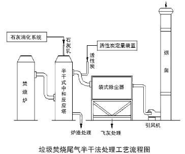 目前垃圾焚燒煙氣凈化處理多采用半干法,即石灰漿中和+活性炭噴入+袋式除塵器的組合工藝,其工藝流程如圖所示。