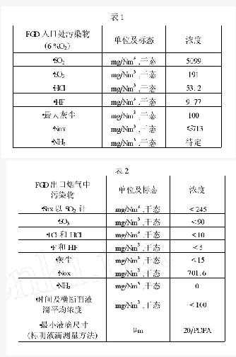 表1、表 2 分別為某一實際工程采用 CT - 121 工藝的FGD入口、出口污染物濃度。