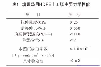 HDPE土工膜按規格幅寬一般為3m、3.5m、4m、6m、7m,衛生填埋場鋪設面積較大,考慮減少焊縫和施工周期,設計要求幅寬大于6m。對于力學性能,主要指標要求如表1。