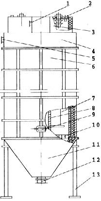 6.電(dian)場;7.電(dian)暈極;8.中(zhong)心(xin)筒;9.檢查門(men);10.均流(liu)網(wang);11.底斗(dou);12.卸灰(hui)閥;13.支腿