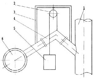 1.生產系(xi)統(tong)煙(yan)塵管(guan)(guan)(guan)道;2.滑(hua)輪;3.滑(hua)輪架;4.隔斷(duan)管(guan)(guan)(guan);5.配重(zhong)體;6.收塵系(xi)統(tong)主管(guan)(guan)(guan)道