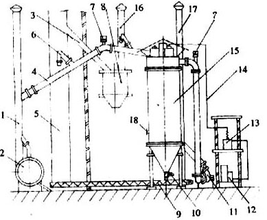 1.煤磨煙(yan)囪;2.煤磨;3.溜槽(cao);4.引風管道;5.提(ti)升(sheng)機(ji);6.隔斷(duan)裝(zhuang)置(zhi);7.煤氣分離排放裝(zhuang)置(zhi);8.貯煤倉;9.螺(luo)旋輸送機(ji);10.卸灰閥;11.風機(ji);12.控(kong)制柜;13.超(chao)(chao)高(gao)壓發生器(qi);14.超(chao)(chao)高(gao)壓電(dian)(dian)纜;15.立式超(chao)(chao)寬極(ji)距電(dian)(dian)收塵器(qi);16.貯煤倉煙(yan)囪;17.電(dian)(dian)收塵器(qi)煙(yan)囪;18.抗爆閥