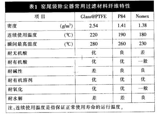 窯尾袋除塵器常用過濾材料的具體性能見表1。