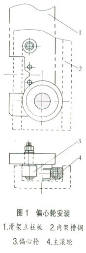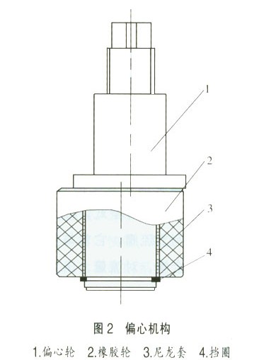 如圖1所示,在滑架立柱板的下端主滾輪的側上方增加一個凸輪裝置。安裝時,將凸輪有效半徑調整到最大,充分與內架槽鋼翼板面接觸。當貨叉架沿門架上下運動時,依靠偏心輪調整其與內架的間隙,利用偏心機構上的橡膠與翼板面的接觸,吸收運動時產生的噪聲,可有效地降低滑架主滾輪與槽鋼之間產生的噪聲。使用一段時間后,若橡膠輪磨損或損壞,則可拆掉擋圈更換。偏心機構如圖2所示。