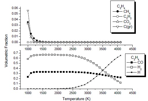 采用低溫水蒸汽(150℃~250℃)作為等離子體炬的工作氣體,即采用水蒸汽作為有機廢物的氣化介質,經等離子體炬加熱后的水蒸汽,平均溫度高達5000℃,與常規的水蒸汽氣化相比,蒸汽等離子體氣化具有一系列優點,它為氣化反應提供了一個高溫、高能環境,物料加熱速率快,反應速率快,有很高的處理效率,還能發生一些在普通氣化條件下不能發生的反應;尤其是對難處理危險廢物及特殊要求廢物,其先進性與優越性進一步顯現出來, 成為有機廢物處理領域中最有發展前途,最引人關注的一項高科技技術。圖1 為聚乙烯與蒸汽反應C/O 為1 時不同溫度下的氣體成份。圖2 為不同C/O 比1500K 時的氣體成份和H2、 CO 摩爾比。