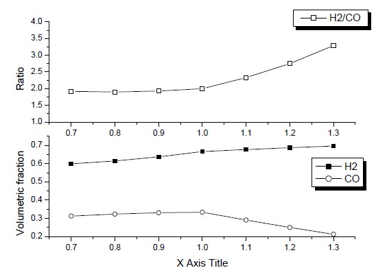 ![]() 圖 2 不同碳氧比下產生氣體成份及H2、CO 摩爾比 |