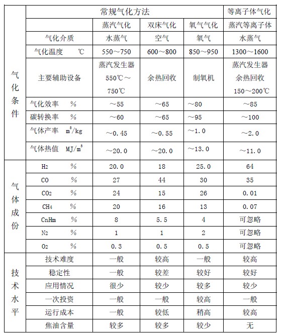 另外一方面,從表中可以看出,除了氣化參數和氣體成份有較大差別以外,在技術水平上也有一定的不同。總的來說,常規水蒸氣氣化相對較差,而氧氣氣化和雙流化床氣化各有千秋,蒸汽等離子體的氣化效果最佳,但是技術也最復雜,運行成本也最高,目前,主要應用于有毒廢物的氣化領域,具有獨特的優勢。