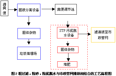 第二種方法(粗過濾、除砂與市政管網排放相結合的工藝),只是在第一種方法基礎上的改進,這種方法解決了糞便集中,有序排放,不對環境造成污染。同時減輕了砂石等重物給市政管網帶來的堵塞條件,減少了由此造成的管道清淤工作量,從某種程度上看,是真正提高了人文素質。但由此給管網帶來的有機物沖擊負荷沒有減少。因此這種方法和第一種方法很接近,只不過多去除了一些砂石重物,COD、BOD成分仍幾乎沒有減量。這種方法是前者的進化,但這不能實現糞便無害化、資源化處理。