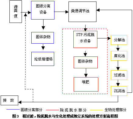 (3) 當城市污水處理廠處理負荷已經較重,或糞便站的無法和污水廠接軌,應該采用粗過濾、除砂、除泥脫水、生化處理獨立系統的工藝處理方案。因為: