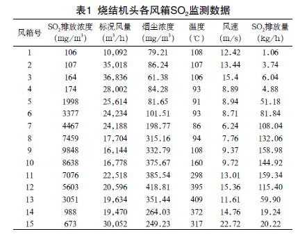 現場測試分析得出:燒結機大煙道中,煙氣SO2平均濃度為3076mg/m3;燒結機15個風箱的SO2濃度呈現頭尾兩端低、中間高的特點,即1#~4#、14#及15#頭尾兩端的風箱SO2平均濃度僅為346.1mg/m3,風量占總風量的46%,SO2排放量占總排放量的5.17%;5#~13#中間風箱的SO2濃度高,平均濃度為5398.2mg/m3,風量占總風量的54%,SO2排放量占總排放量的(de)94.83%。