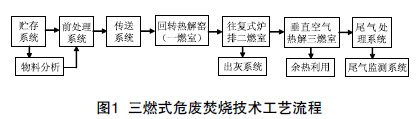 三燃式危廢焚燒(shao)技術(shu)采用13米長的回轉(zhuan)熱解窯(yao)作為(wei)一(yi)次燃燒(shao)處(chu)理方式,再由往復式爐排爐進行二次焚化燃燒(shao),未(wei)燃盡的氣體、粉塵(chen)進入三燃室充分分解燃燒(shao),可以達(da)到高的燒(shao)盡率(lv)和熱能效率(lv)。其工藝流(liu)程如(ru)圖1。