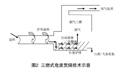 三燃式危廢焚燒技術為結合新舊工藝特點而研制出的一種新型焚燒技術。該新型焚燒爐采用回轉熱解窯作為一次燃燒處理方式,再由往復式爐排爐進行二次焚化燃燒,未燃盡的氣體粉塵進入三燃室充分分解燃燒,因此燒盡率高、熱能效率高,有較強的應用推廣價值。