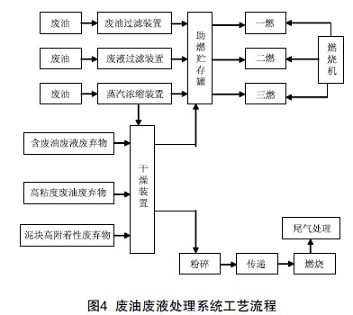 對(dui)于工業生產中(zhong)所產生的廢(fei)油(you)、廢(fei)液(ye)、重油(you)等物(wu)質(zhi),在前(qian)處理系(xi)統(tong)中(zhong),可采用(yong)廢(fei)油(you)、廢(fei)液(ye)過濾和(he)重油(you)蒸(zheng)汽濃縮裝置進(jin)行預處理,而(er)對(dui)含廢(fei)油(you)、廢(fei)液(ye)的工業廢(fei)棄(qi)物(wu)與高(gao)粘度油(you)廢(fei)物(wu)可采用(yong)干(gan)燥方(fang)式加(jia)以(yi)處理后再進(jin)行燃燒。廢(fei)油(you)廢(fei)液(ye)處理系(xi)統(tong)工藝流程(cheng)見圖4。