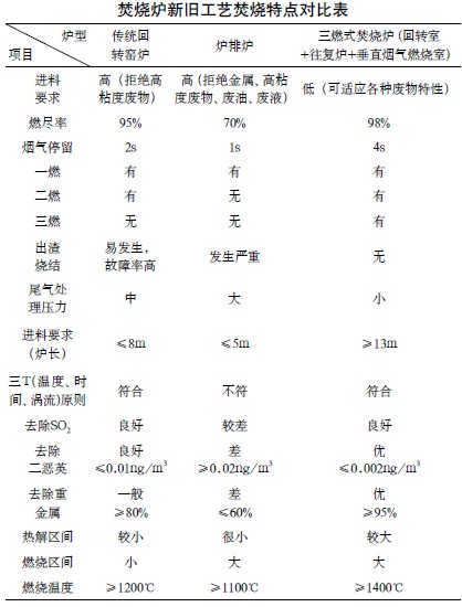 (1)采用傳(chuan)統的(de)回(hui)轉窯(yao)爐(lu)與(yu)往(wang)(wang)復(fu)式爐(lu)排爐(lu)相(xiang)結合的(de)焚(fen)燒(shao)技(ji)術,將回(hui)轉窯(yao)爐(lu)的(de)窯(yao)爐(lu)作為一(yi)(yi)燃(ran)(ran)室對各種垃(la)圾與(yu)廢棄物(wu)(wu)(wu)進行充分(fen)的(de)熱(re)(re)解(jie)氣(qi)(qi)(qi)化(hua)(hua),回(hui)轉窯(yao)爐(lu)的(de)尾(wei)端與(yu)往(wang)(wang)復(fu)式爐(lu)排爐(lu)上下(xia)(xia)相(xiang)連,使在(zai)回(hui)轉窯(yao)爐(lu)(一(yi)(yi)燃(ran)(ran)室)里熱(re)(re)解(jie)氣(qi)(qi)(qi)化(hua)(hua)的(de)物(wu)(wu)(wu)料或沒有(you)燃(ran)(ran)盡(jin)的(de)物(wu)(wu)(wu)料隨著轉爐(lu)旋轉自動進入往(wang)(wang)復(fu)式爐(lu)排進行二(er)(er)(er)次(ci)焚(fen)化(hua)(hua)(二(er)(er)(er)燃(ran)(ran)室),從而徹(che)底(di)解(jie)決(jue)了(le)因垃(la)圾廢棄物(wu)(wu)(wu)料密度不(bu)(bu)同而帶(dai)來的(de)燃(ran)(ran)燒(shao)不(bu)(bu)充分(fen)和煙氣(qi)(qi)(qi)停(ting)留(liu)時間(jian)短等問題;在(zai)往(wang)(wang)復(fu)式爐(lu)排上方設置垂直空氣(qi)(qi)(qi)燃(ran)(ran)燒(shao)室(三燃(ran)(ran)室),讓煙氣(qi)(qi)(qi)進行再次(ci)燃(ran)(ran)燒(shao),使煙氣(qi)(qi)(qi)停(ting)留(liu)時間(jian)大于4s,可從根本上解(jie)決(jue)垃(la)圾焚(fen)燒(shao)所(suo)產生的(de)煙氣(qi)(qi)(qi)帶(dai)來的(de)二(er)(er)(er)次(ci)污染問題。焚(fen)燒(shao)爐(lu)新(xin)舊工藝的(de)焚(fen)燒(shao)特(te)點對比見下(xia)(xia)表。