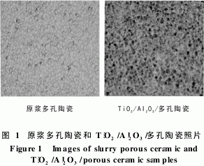 2.1 工藝條件對多(duo)孔陶(tao)瓷(ci)(ci)載(zai)體制(zhi)備的影響 原漿多(duo)孔陶(tao)瓷(ci)(ci)和TiO2/Al2O3/多(duo)孔陶(tao)瓷(ci)(ci)照(zhao)片如 圖1所示。