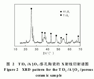 焙燒工藝(yi)對(dui)TiO2涂(tu)敷效果有(you)至(zhi)關(guan)重要的(de)(de)(de)影響[9],本(ben)實(shi)驗采用(yong)在(zai)(zai)相同工藝(yi)條件下(xia)(xia)涂(tu)敷相同質量 比(bi)(bi)的(de)(de)(de)6組(zu)樣品作對(dui)比(bi)(bi)試驗,分(fen)別在(zai)(zai)350℃、400℃、 450℃、500℃、550℃和(he)600℃保溫(wen)2h。實(shi)驗發 現(xian),在(zai)(zai)低溫(wen)下(xia)(xia)TiO2涂(tu)層容易脫落(luo),但(dan)表(biao)面(mian)空隙多(duo),比(bi)(bi)表(biao)面(mian)積(ji)大(da)(da)。而在(zai)(zai)高(gao)溫(wen)條件下(xia)(xia)焙燒的(de)(de)(de)TiO2涂(tu)層吸附(fu) 性好,但(dan)表(biao)面(mian)密實(shi),比(bi)(bi)表(biao)面(mian)積(ji)小。500℃焙燒的(de)(de)(de) TiO2/Al2O3/多(duo)孔陶瓷的(de)(de)(de)X衍射譜(pu)圖(tu)如圖(tu)2所示。 由圖(tu)2可見,活性組(zu)分(fen)TiO2/Al2O3的(de)(de)(de)含量豐富并以銳鈦礦結(jie)構存在(zai)(zai),具(ju)有(you)較(jiao)高(gao)的(de)(de)(de)催化活性,TiO2涂(tu)層 有(you)著較(jiao)好的(de)(de)(de)吸附(fu)性和(he)較(jiao)大(da)(da)的(de)(de)(de)比(bi)(bi)表(biao)面(mian)積(ji)。