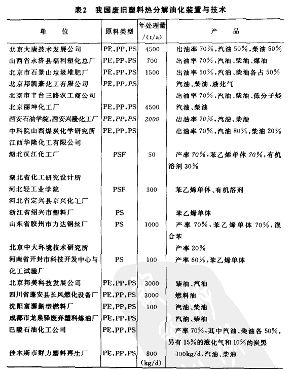 近年來,國內研究開發了不少回收苯乙烯單體的方法。盡管這些方法比較簡單,但實用、有效,而且設備投資均不需很多。據了解,除表2中的單位外,吉林工學院、華南環境資源研究所、武漢化工研究所、武漢塑料研究所等單位都研究過用廢聚苯乙烯塑料回收苯乙烯的方法,其回收工藝大致相同,其過程均是:加熱一(反應釜)分解一粗苯乙烯一粗餾一苯乙烯成品,反應溫度一般在300一500℃。反應時加入少量催化劑,因各自的方法不同,最后獲得的苯乙烯產率在70%一90%不等。最后的剩余物可作為防水材料。