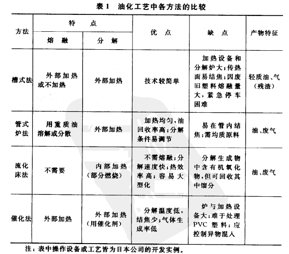 目前廢舊塑料的油化法已有格式、管式爐、流化床和催化法,它們各自的工藝特點見表1。表中所列4種方法的工藝設備可以處理PVC、PP、aPP、PE、PS、PMMA等多種廢舊塑料,只是不同工藝設備更適于熱解某種廢舊塑料而已。所得熱分解產物皆以油類為主,其次是部分可利用的燃料氣、殘渣、廢氣等。