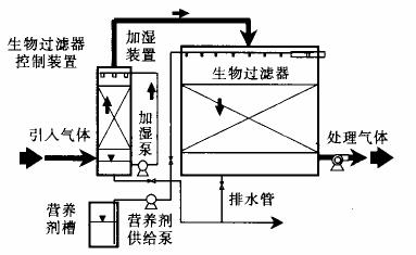 這是一種由韓國LG環境安全研究院研發,上海韓華環保設備技術工程有限公司制作代理的設備。它與文丘里洗滌除塵+生物過濾池沒什么區別,只是改進了原來粗放的方式,用精細的設備代替了生物過濾池,采用先進的微生物膜代替了堆肥、泥煤、樹皮、植物或碎木的混合物作為菌床,采用可控的環境使其運行更為可靠,克服了前述方法體積過大的缺點。設置了加濕裝置,氣體經加濕并除去灰塵后進入生物過濾器,通過附著在過濾介質的表面,經微生物將廢氣中的有害成分分解為CO2、H2O和無害的堿。該方法對去除氨和硫系列的惡臭成分有較好的效果。工藝如下圖所示。