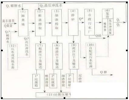 6.在水資源豐富、取水容易的地方,可采用江河水用作糞便稀釋水和格柵機高壓沖洗水,一般情況下,用市政污水處理廠的排放水Ql作稀釋水,用江河水Q*2作高壓沖洗水更為適宜。