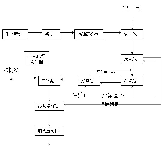 生產廢水先經過格柵預處理以去除廢水中較大顆粒的懸浮物(保證后續處理單元的正常運行),然后進入隔油沉砂池,浮渣、浮油定期打撈清運。經格油沉淀后的廢水進入調節池進行水量、水質調節,經調節后的廢水用泵提升進入厭氧池,使高COD物質在該段得到部分降解,同時可提高廢水的生化性,然后進入缺氧池,進行反硝化過程,最后進入好氧池氧化降解有機物和進行硝化反應。好氧池出水混合液一部分回流到缺氧池,并與厭氧池出水混合,利用厭氧池出水中的碳源進行反硝化處理,另一部分出水進入二沉池,經沉淀池分離后出水達標外排。二沉池剩余污泥與厭氧池污泥一起排入污泥濃縮池,經初步重力濃縮后用泵打入廂式壓濾機進行脫水處理,濾液自流到調節池,壓濾后的污泥與預處理浮渣一起外運堆肥或垃圾填埋。由于肉類加工工業污水中含有一定數量的有毒菌體,故在出水前加二氧化氯以殺菌消毒,避免污染水體。