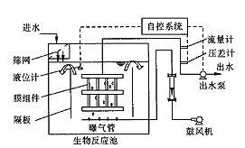 洗浴污(wu)水(shui)經(jing)0.9 mm的不銹鋼(gang)篩網過(guo)(guo)濾(lv)后(hou)進入高(gao)位水(shui)箱,再流入生物反應池,有(you)機(ji)物被活性污(wu)泥中的微(wei)生物分解(jie),混(hun)合液在出水(shui)泵(beng)的抽吸作用(yong)(yong)下經(jing)膜過(guo)(guo)濾(lv)后(hou)形(xing)成(cheng)處理(li)出水(shui)。出水(shui)泵(beng)采用(yong)(yong)間歇方式運行,即開13min,停4 min。整個系統的設(she)計處理(li)能力(li)(li)為(wei)(wei)10 m3 /d,水(shui)力(li)(li)停留(liu)時(shi)間(HRT)為(wei)(wei)3.15 h,試驗過(guo)(guo)程沒有(you)人為(wei)(wei)排泥。