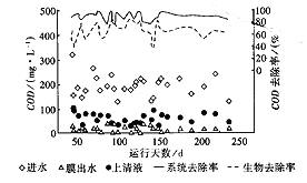 圖2為原水、生物(wu)反應池上清液和膜過濾出水的COD變化情況(kuang)以及(ji)系統各(ge)部分對COD 的去除效果。