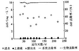 以上結果說明LAS的(de)(de)去除主要(yao)靠生(sheng)物反應池中微(wei)生(sheng)物的(de)(de)分解作用,膜(mo)對LAS的(de)(de)截留(liu)作用很(hen)小(xiao)。