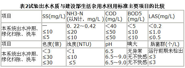 表(biao)2匯總了(le)系統穩定(ding)運行后的膜出(chu)水(shui)水(shui)質與建設(she)部頒布的生(sheng)活雜(za)用水(shui)回用標(biao)準(CJ25.1—19 89)的主要項(xiang)目比較。大腸菌群(qun)在(zai)運行前期(qi)未檢(jian)出(chu),故在(zai)運行后期(qi)沒有繼(ji)續(xu)檢(jian)測(ce),但發(fa)現膜內表(biao)面滋生(sheng)有微生(sheng)物,可能對出(chu)水(shui)會造成一定(ding)影響。其余各(ge)項(xiang)出(chu)水(shui)水(shui)質指標(biao)均滿(man)足雜(za)用水(shui)回 用標(biao)準,也就(jiu)是(shi)說(shuo),膜出(chu)水(shui)只需經簡(jian)單消毒處(chu)理(li)就(jiu)可以安(an)全(quan)回用于沖廁、綠(lv)化、掃除、洗車等(deng)場合。