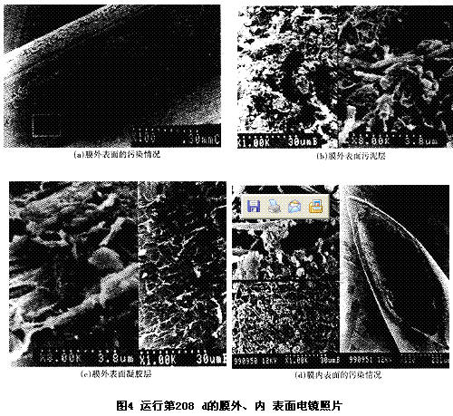 為了解造成(cheng)膜(mo)(mo)(mo)(mo)(mo)(mo)污(wu)染的(de)(de)原因,運行第208 d時剪下(xia)一段膜(mo)(mo)(mo)(mo)(mo)(mo)絲進行電(dian)鏡觀察(見(jian)圖(tu)4)。可(ke)以看出(chu), 膜(mo)(mo)(mo)(mo)(mo)(mo)外表(biao)面(mian)(mian)污(wu)泥(ni)(ni)(ni)沉(chen)積(ji)情(qing)況很不均(jun)勻(圖(tu)4a)。在膜(mo)(mo)(mo)(mo)(mo)(mo)絲內部負壓和(he)膜(mo)(mo)(mo)(mo)(mo)(mo)面(mian)(mian)紊(wen)流形(xing)成(cheng)的(de)(de)剪切(qie)力等雙重作(zuo)(zuo)用下(xia),有些污(wu)泥(ni)(ni)(ni)在膜(mo)(mo)(mo)(mo)(mo)(mo)外表(biao)面(mian)(mian)的(de)(de)局部沉(chen)積(ji)下(xia)來(lai)(lai),這些沉(chen)積(ji)污(wu)泥(ni)(ni)(ni)由絲狀(zhuang)真(zhen)菌(jun)(jun)(jun)、放線菌(jun)(jun)(jun)、球菌(jun)(jun)(jun)和(he)桿菌(jun)(jun)(jun)組成(cheng)。絲狀(zhuang)真(zhen)菌(jun)(jun)(jun)表(biao)面(mian)(mian)輪廊清晰,產生(sheng)的(de)(de)分(fen)泌物(wu)較少,而其余菌(jun)(jun)(jun)種(zhong)周圍(wei)(wei)都有厚(hou)厚(hou)的(de)(de)一層分(fen)泌物(wu)。這些分(fen)泌物(wu)不僅對(dui)凝結(jie)菌(jun)(jun)(jun)膠團起到了重要(yao)作(zuo)(zuo)用(圖(tu)4b),還(huan)附(fu)著于(yu)膜(mo)(mo)(mo)(mo)(mo)(mo)表(biao)面(mian)(mian)或進入(ru)膜(mo)(mo)(mo)(mo)(mo)(mo)的(de)(de)孔道成(cheng)為膜(mo)(mo)(mo)(mo)(mo)(mo)表(biao)面(mian)(mian)凝膠層的(de)(de)重要(yao)組成(cheng)物(wu)質(zhi)(圖(tu)4c)。另一方面(mian)(mian)凝膠層對(dui)膜(mo)(mo)(mo)(mo)(mo)(mo)外表(biao)面(mian)(mian)的(de)(de)污(wu)染相(xiang)當(dang)普(pu)遍,整體來(lai)(lai)看形(xing)成(cheng)得相(xiang)對(dui)均(jun)勻,但從小范(fan)圍(wei)(wei)來(lai)(lai)看厚(hou)度差異較大,變化于(yu)0~5μm之(zhi)間(圖(tu)4c)。