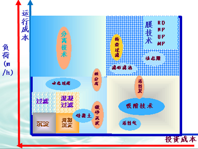 近些年膜技術發展迅速,但其在運行費用、投資成本上仍然很高,與低投資的傳統混凝沉淀技術、過濾技術存在鴻溝,實際上分離技術有很多,而膜技術只占了最頂端的一隅。2009年6月27日的“2009水業高級技術論壇”上,清華大學王凱軍教授與來自新型沉淀技術、過濾技術的企業家一起,細述了新型沉淀技術、過濾技術的原理與應用,王教授評價活性焦吸附技術、磁分離技術以及硅藻土微砂過濾技術和新材料的動態膜、轉盤過濾和濾布濾池等技術的不斷工程應用,使得我們在滿足出水以及過濾的要求下,在低投資、低成本與高投資、高成本之間有了很多選擇。