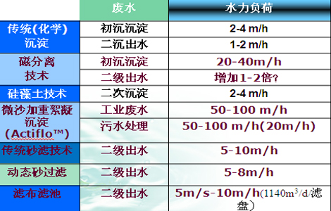傳統的沉淀原理非常簡單,顆粒如果在出水前沉淀到出水管之下即被去除,而沒有沉淀的顆粒就被水流帶走,因此導致初沉池的水力負荷為2-4m/h、二沉池的水力負荷是1-2m/h,磁分離(Comag)技術、硅藻土技術、ActifloTM技術都是通過載體增加了絮體的比重,強化了分離效果。磁分離技術主要是通過投加混凝劑和磁種,由于磁種的重力作用達到絮凝物高效沉淀;硅藻土具有兩個功能,一是微孔吸附(整個尺寸在30μm-50μm,且微孔尺寸小于1μm),二是硅藻土中含有鋁、鐵等重金屬元素具有混凝的作用;ActifloTM技術是在絮體間投加了微砂合成大顆粒絮體,加快污染物的沉淀速度;這三種技術的原理都是增加比重,可以說代表了沉淀技術方向的進展。