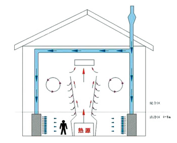 在(zai)有熱源(yuan)的(de)(de)(de)(de)(de)(de)車(che)間(jian),由(you)(you)于(yu)(yu)在(zai)高(gao)度上(shang)(shang)(shang)(shang)具(ju)有穩(wen)定(ding)的(de)(de)(de)(de)(de)(de)溫度梯度,如果以較(jiao)低(di)(di)的(de)(de)(de)(de)(de)(de)風(feng)速(su)(v<0.2~0.5m/s),較(jiao)大的(de)(de)(de)(de)(de)(de)風(feng)量,將送風(feng)溫差(cha)較(jiao)小(Δt=2~4℃)的(de)(de)(de)(de)(de)(de)新(xin)(xin)(xin)鮮(xian)空(kong)氣(qi)直接送入室內工(gong)作(zuo)(zuo)(zuo)(zuo)區(qu),低(di)(di)溫的(de)(de)(de)(de)(de)(de)新(xin)(xin)(xin)風(feng)在(zai)重力作(zuo)(zuo)(zuo)(zuo)用(yong)下(xia)(xia)先是下(xia)(xia)沉,隨后慢慢擴散,在(zai)地面上(shang)(shang)(shang)(shang)形成一層薄(bo)薄(bo)的(de)(de)(de)(de)(de)(de)空(kong)氣(qi)層。而(er)室內熱源(yuan)產(chan)生的(de)(de)(de)(de)(de)(de)熱氣(qi)流,由(you)(you)于(yu)(yu)浮力作(zuo)(zuo)(zuo)(zuo)用(yong)而(er)上(shang)(shang)(shang)(shang)升,并不(bu)斷(duan)卷(juan)(juan)吸(xi)周圍空(kong)氣(qi)。這樣,由(you)(you)于(yu)(yu)熱氣(qi)流上(shang)(shang)(shang)(shang)升時的(de)(de)(de)(de)(de)(de)卷(juan)(juan)吸(xi)作(zuo)(zuo)(zuo)(zuo)用(yong),后續(xu)新(xin)(xin)(xin)風(feng)的(de)(de)(de)(de)(de)(de)推動(dong)作(zuo)(zuo)(zuo)(zuo)用(yong)和(he)抽風(feng)口(kou)的(de)(de)(de)(de)(de)(de)抽吸(xi)作(zuo)(zuo)(zuo)(zuo)用(yong),地板上(shang)(shang)(shang)(shang)方的(de)(de)(de)(de)(de)(de)新(xin)(xin)(xin)鮮(xian)空(kong)氣(qi)緩(huan)(huan)緩(huan)(huan)向(xiang)上(shang)(shang)(shang)(shang)移動(dong),形成類似(si)于(yu)(yu)向(xiang)上(shang)(shang)(shang)(shang)的(de)(de)(de)(de)(de)(de)均勻流的(de)(de)(de)(de)(de)(de)流動(dong),于(yu)(yu)是工(gong)作(zuo)(zuo)(zuo)(zuo)區(qu)的(de)(de)(de)(de)(de)(de)污濁空(kong)氣(qi)被后續(xu)的(de)(de)(de)(de)(de)(de)新(xin)(xin)(xin)風(feng)所取代。當達到穩(wen)定(ding)時,室內空(kong)氣(qi)在(zai)溫度、濃度上(shang)(shang)(shang)(shang)便形成兩個區(qu)域:上(shang)(shang)(shang)(shang)部(bu)混合區(qu)和(he)下(xia)(xia)部(bu)單向(xiang)流動(dong)的(de)(de)(de)(de)(de)(de)清潔區(qu)。