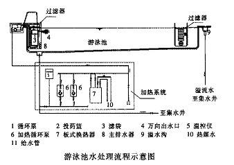 游泳池水一投藥籃 (毛發聚集器)一過濾袋 (6微米)一循環水泵一 熱交換器一游泳池
