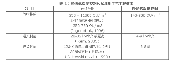 表1將ENS氧溫度控制堆肥工藝與傳統工藝進行對比。