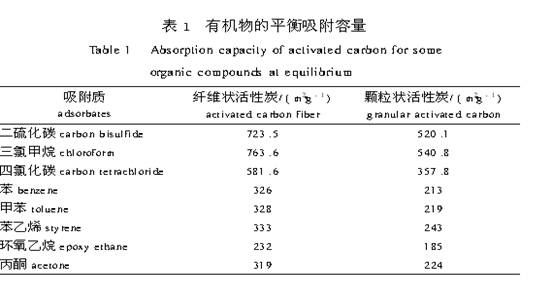 揮發性有機物大多屬于非極性或弱極性物質,因此適于選用非極性吸附劑來進行吸附。活性炭是一種非極性的多孔材料,對非極性或弱極性的揮發性有機物有較強的吸附能力。除此之外,由于活性炭的孔徑范圍寬,吸附容量大,因此廣泛用于吸附室內空氣中的揮發性有機化合物。活性炭對氣體的吸附能力可用“親合系數”和“平衡吸附容量”來表述,顆粒活性炭對一些氣體的親合系數分別為[4]:苯1.0、甲苯1.25、二甲苯1.43、甲醛0.52、氯乙烷0.75、丙酮0.88、氯仿0.86、四氯化碳1.05、正己烷1.35、正庚烷1.59、氨0.28。對一些有機物的平衡吸附容量見表1[9]。